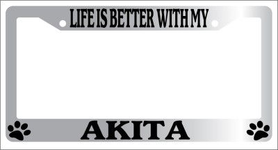 Chrome Metal license plate frame LIFE IS BETTER WITH MY AKITA made from high quality steel plated in chrome, covered with premium outdoor color vinyl printing with a minimum life expectancy of 7 year. The vinyl is designed to stand up to the elements and will not peel off in car washes or other elements your car may be subjected to.