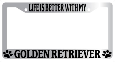 Chrome Metal license plate frame LIFE IS BETTER WITH MY GOLDEN RETRIEVER made from high quality steel plated in chrome, covered with premium outdoor color vinyl printing with a minimum life expectancy of 7 year. The vinyl is designed to stand up to the elements and will not peel off in car washes or other elements your car may be subjected to.