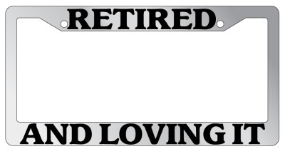 Chrome Metal license plate frame RETIRED AND LOVING IT made from high quality steel plated in chrome, covered with premium outdoor color vinyl printing with a minimum life expectancy of 7 year. The vinyl is designed to stand up to the elements and will not peel off in car washes or other elements your car may be subjected to.