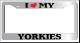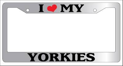 Chrome Metal license plate frame I HEART MY YORKIES made from high quality steel plated in chrome, covered with premium outdoor color vinyl printing with a minimum life expectancy of 7 year. The vinyl is designed to stand up to the elements and will not peel off in car washes or other elements your car may be subjected to.