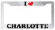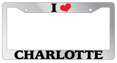 Chrome Metal license plate frame I HEART CHARLOTTE made from high quality steel plated in chrome, covered with premium outdoor color vinyl printing with a minimum life expectancy of 7 year. The vinyl is designed to stand up to the elements and will not peel off in car washes or other elements your car may be subjected to.