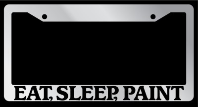 Chrome Metal license plate frame EAT, SLEEP, PAINT made from high quality steel plated in chrome, covered with premium outdoor color vinyl printing with a minimum life expectancy of 7 year. The vinyl is designed to stand up to the elements and will not peel off in car washes or other elements your car may be subjected to. This frame is designed to last. Designed to withstand outdoor conditions