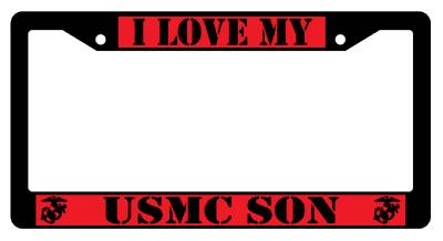 Black License Plate Frame I LOVE MY USMC SON (RED) Auto Accessory