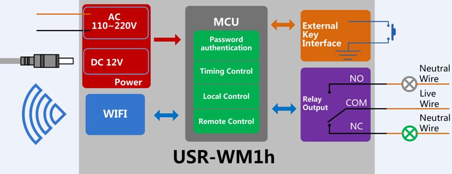 USR-WM1 supports multiple input power; 1 relay output, including normally open and normally closed.