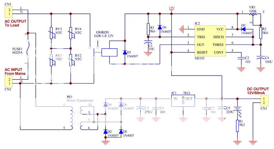 220Vac Mains Power ON Delay Soft-start Protection Module, with power transformer and regulator circuit.