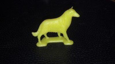 Processed Plastic German Shepherd Dog from Farm Animal Set. Yellow Plastic Approx. 2" 0r 50mm Long. 1970s to approx. 2005. soft plastic.