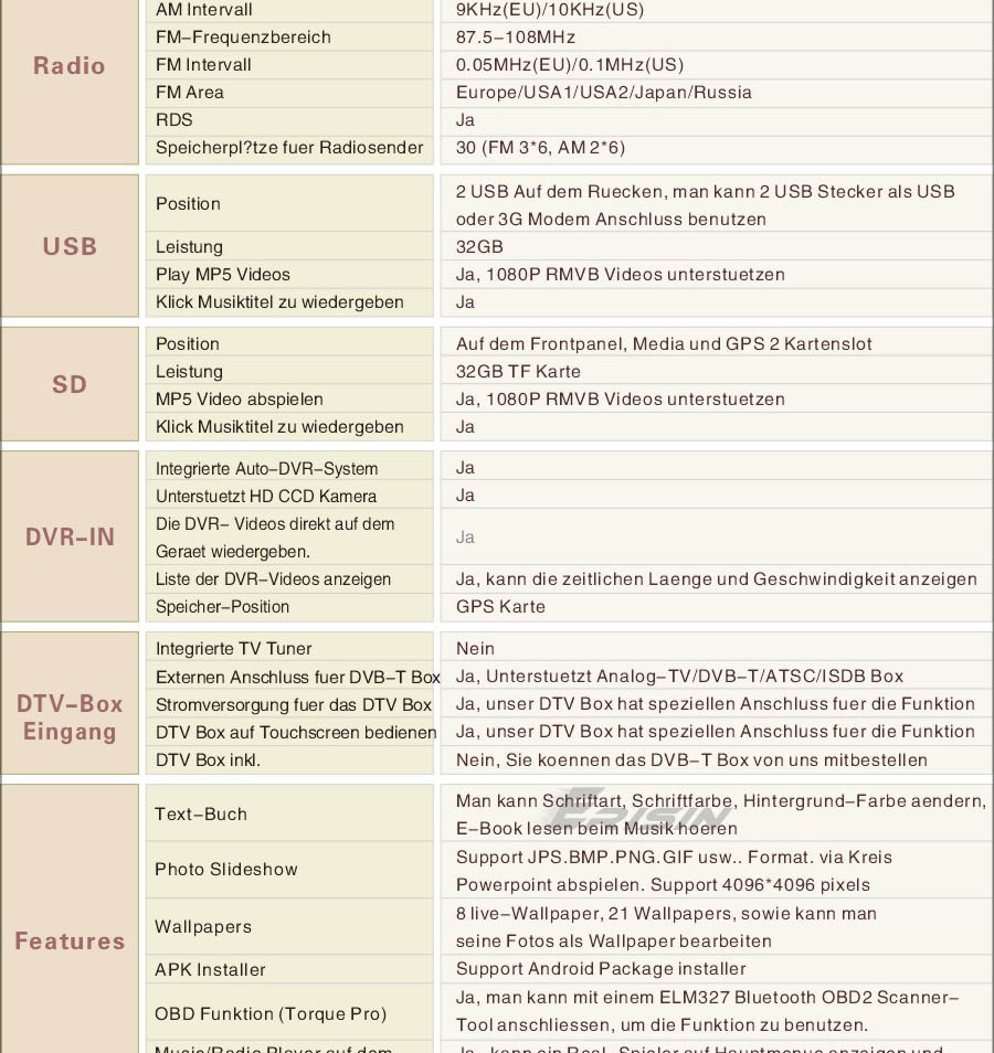 Radio, RDS, Bluetooth, USB, SD, Rückfahrkamera-Ein, AUX,