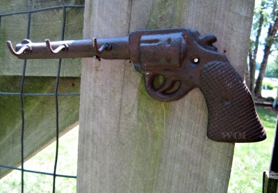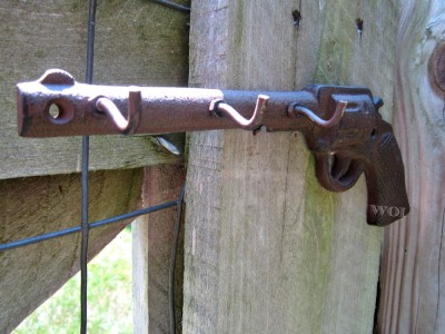 Western revolver hand gun hanging wall key hook.