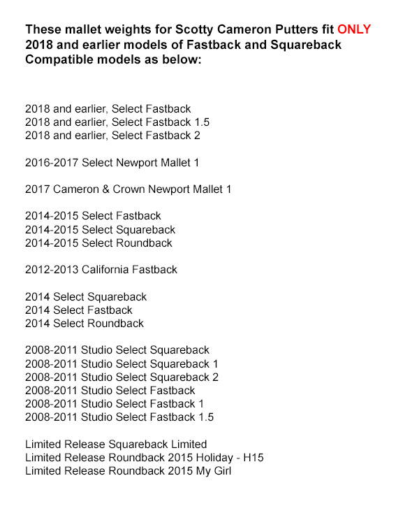 Note: Included mallet weights will only fit 2008 Studio Select Fastback 1 and Squareback 1 & 2; 2014 Select Squareback, Fastback, Roundback; and 2016 Newport Mallet 1; California Fastback and 2018 Select Fastback and Fastback 2 putters. Other model putters use regular weight.