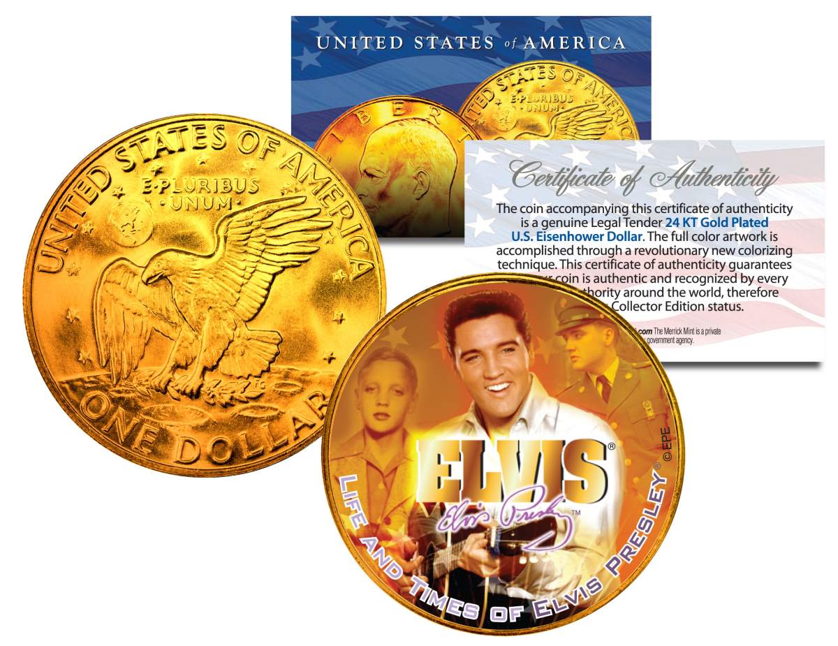 Genuine Legal Tender 1977 Eisenhower "Ike" Dollar. From 1971 to 1978, the U.S. Mint issued dollar coins with the obverse depicting Dwight D. Eisenhower and the reverse the insignia of the Apollo 11 moon landing, both designed by Chief Engraver Frank Gasparro. This milestone coin, never released to the public, is exclusively available here! Uncirculated U.S. Dollar layered in .999 PURE 24 KARAT GOLD! Year 1977, Mint Marks are Randomly Chosen. Comes in a protective air tight capsule. 1977 Marks the death of Elvis Presley