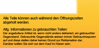 Die Firma LANG-CENTER bietet Ihnen in Ingolstadt und Umgebung seit über 30 Jahren viele Dienstleistungen rund ums Auto: zertifizierte Altautoentsorgung, Gebrauchtwagen An- und Verkauf, Gebrauchtteilehandel, Neuteilehandel Zum Verkauf steht eine gebrauchte, rechte, innere Rückleuchte aus einem BMW E46 Coupe / 3er mit der Teilenummer 8 364 726 Wichtig: Bitte vergleichen Sie die Teilenummer mit der Ihrer Rückleuchte. Das Bild zeigt den angebotenen Artikel im Original. Unser Verkaufsteam steht Ihnen unter der e-mail-Adresse sehr gerne mit Rat und Tat zur Verfügung. Yes, we speak english. Wir führen viele gebrauchte Pkw-Ersatzteile - Fragen kostet nichts. www.lang-center.de - 85080 Gaimersheim - Tel.: 0 84 58 / 15 53 - info@lang-center.de | ![]() |