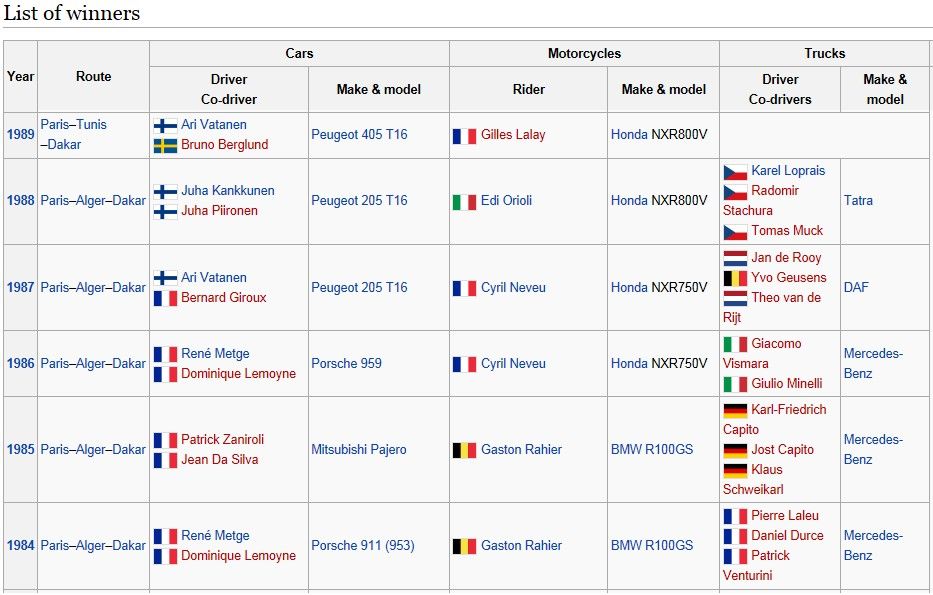 the Porsche 959, Mitsubishi Pajero and turbo-charged Peugeot 205