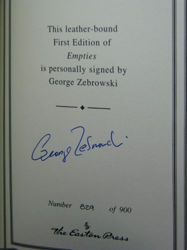 Description: Leatherbound hardback book published by Easton Press in 2009. Bound in top grade red leather with 22kt gold lettering and cover artwork. Hubbed spine, acid neutral paper with page edges gilded, satin moire endpapers, and a satin ribbon book mark sewn in. Collectors note, certificate of authenticity, and unused publisher supplied bookplate laid in (not attached). Issued by Easton Press signed by the author on the limitation page without inscription or personalization. Book number 829 of 900 copies issued by Easton Press as part of the Signed First Editions of Science Fiction series.