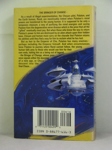 From the Back Cover: The bringer of change - As a result of illegal experimentation, the Choyan Pilot, Palaton, and the Earth human, Rand, are inextricably linked when Palaton's mind powers are transferred to the young human. It is supposed to be only a temporary measure, a way of purifying the mind energies and saving Palaton from the degenerative nerve disease which is the price that all the "gifted" eventually must pay. But when those who know the way to return Palaton's power to him are destroyed by an alien attack upon their hidden base, Choyan and human must carry on the charade that Palaton retains his abilities until they find a way for him to reclaim what he has lost.