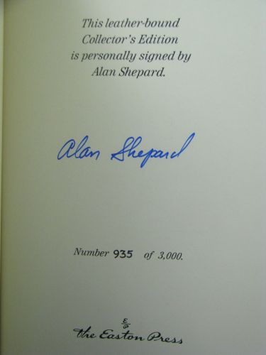 Description: Leatherbound hardback book published by Easton Press in 1997. Bound in high quality black leather, lettering and decoration on covers and spine in 22kt gold, hubbed spine, all page edges gilt, silk bookmark sewn in, satin moire endpapers, and acid neutral pages sewn for durability. Certificate of authenticity and unused publisher supplied bookplate laid in (not attached). Signed by astronaut Alan Shepard on the limitation page without inscription or personalization. Book number 935 from an edition of 3,000 copies issued by Easton Press.