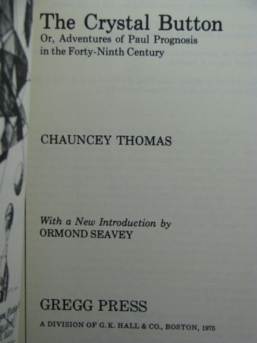 About the Book (written by David Hartwell): The utopia Chauncey Thomas describes in The Crystal Button may seem a remarkable vision for a late nineteenth-century Boston carriage-manufacturer writing in his spare time. His hero, Paul Prognosis, goes into a coma for ten years after an accident and dreams that he is in the city of Tone (new Boston) in 4872, three thousand years in the future. It is a highly sanitized, perfectly organized world with sumptuous architecture - colonnades, triumphal arches, facades alive with sculptured decorations. Paul is filled with wonder by the way things work, and much of the novel is devoted to the operations of pure science - Tone's subway system for example, in which electricity and compressed air are the energy sources for rapid transit. Unlike most utopian novelists Thomas does not moralize, though he faces an awkward paradox in the combination of stability and technology: everything must be changed but also remain permanent. All through the novel there are hints of unresolved anxieties which culminates when the comet Veda appears off schedule and destroys the ordered world of Tone, returning Paul to consciousness in the present.