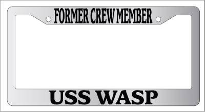 Chrome license plate frame FORMER CREW MEMBER USS WASP made from high impact ABS plastic, chrome plated, and covered with color vinyl printing.