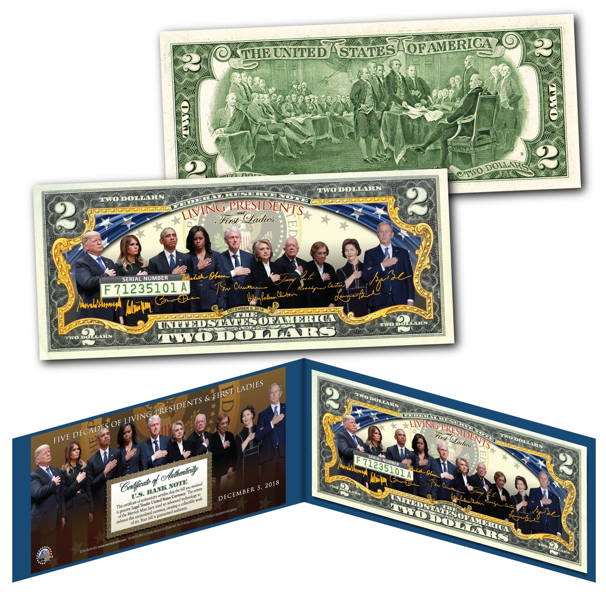 The PRESIDENT JOHN F. KENNEDY uncirculated $2 Bill is Genuine Authentic Legal Tender of the United States, which has been enhanced with a beautiful colorized image of the President and the Seal of the State of his birthplace on the obverse of the bill. The full colorized images are accomplished through a revolutionary new authentic & genuine colorization process pioneered by The Merrick Mint. Included is a Certificate of Authenticity to guarantee that your bills are authentic and recognized by every monetary authority around the world, and assuring its Collector Edition status. Each $2 Bill is in FRESH, CRISP, UNCIRCULATED condition, and was directly removed from untouched wrapped Federal Reserve sealed packs. Former U.S. President Thomas Jefferson is featured on the obverse of the note, along with the special colorization overlay. The Signing of the Declaration of Independence by John Trumbull is featured on the reverse. It is the only U.S. Currency note that features two Presidents, John Adams and Thomas Jefferson, and it is one of the most rarely seen BILLS in circulation and actual use.