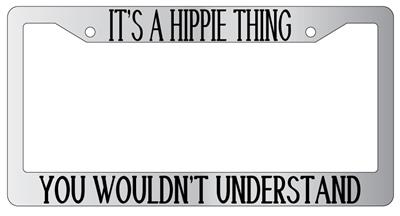 Chrome license plate frame IT'S A HIPPIE THING YOU WOULDN'T UNDERSTAND made from high impact ABS plastic, chrome plated, and covered with color vinyl printing.