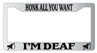 Chrome license plate frame HONK ALL YOU WANT I'M DEAF made from high impact ABS plastic, chrome plated, and covered with color vinyl printing.