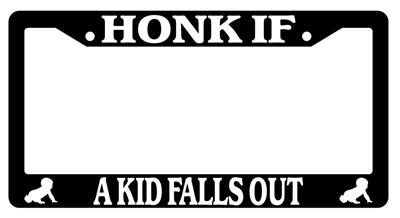 Black license plate frame HONK IF A KID FALLS OUT LOGOS made from high impact ABS plastic, covered with color vinyl printing.