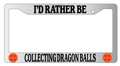 Chrome license plate frame I'D RATHER BE COLLECTING DRAGONBALLS made from high impact ABS plastic, chrome plated, and covered with color vinyl printing.