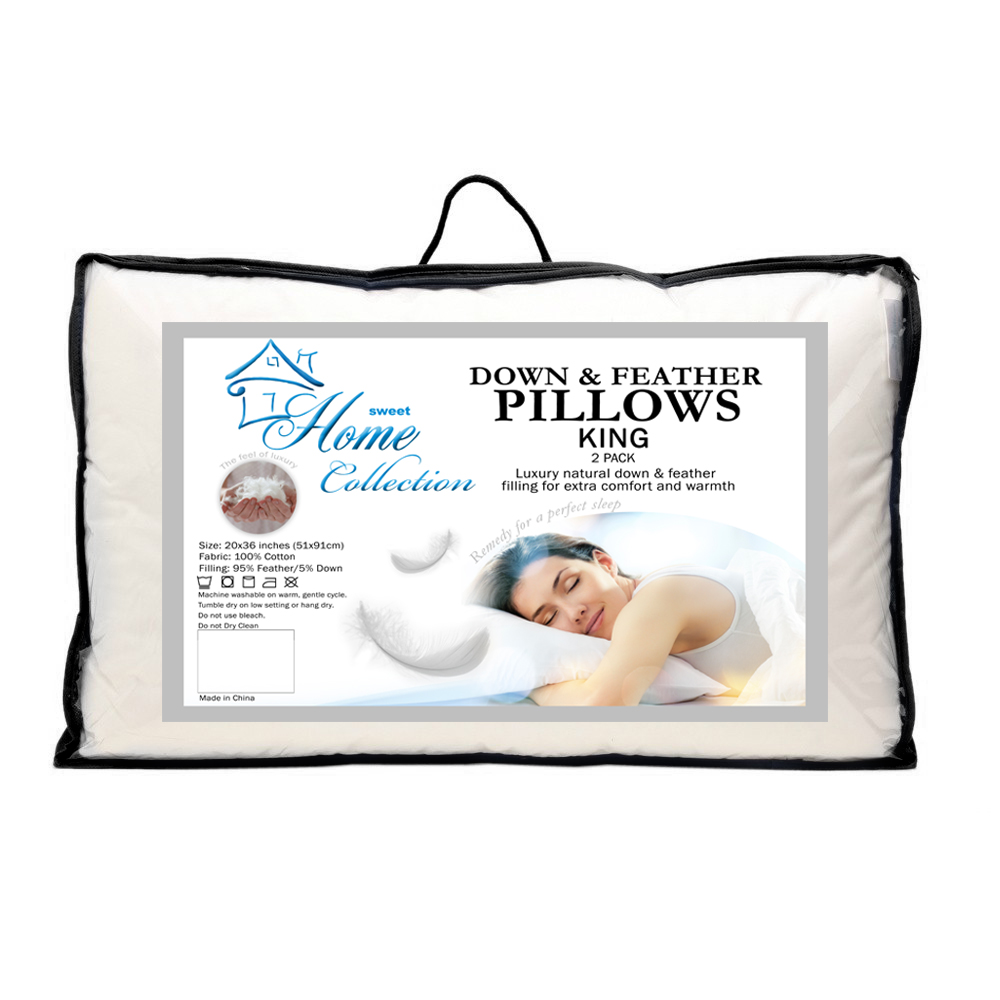 The Sweet Home Collection Luxury Natural Down and Feather Pillows are the remedy for a perfect sleep. This 2 Pack comes neatly packaged in a zippered carrying case with handles that can be used for travel or storage.