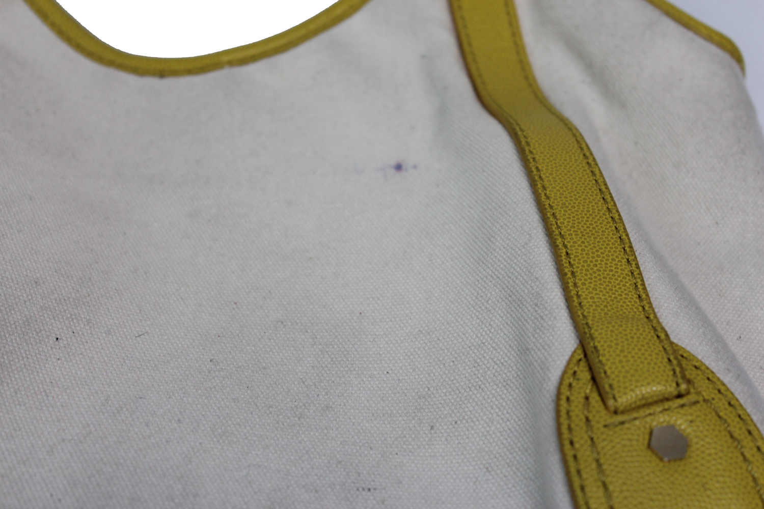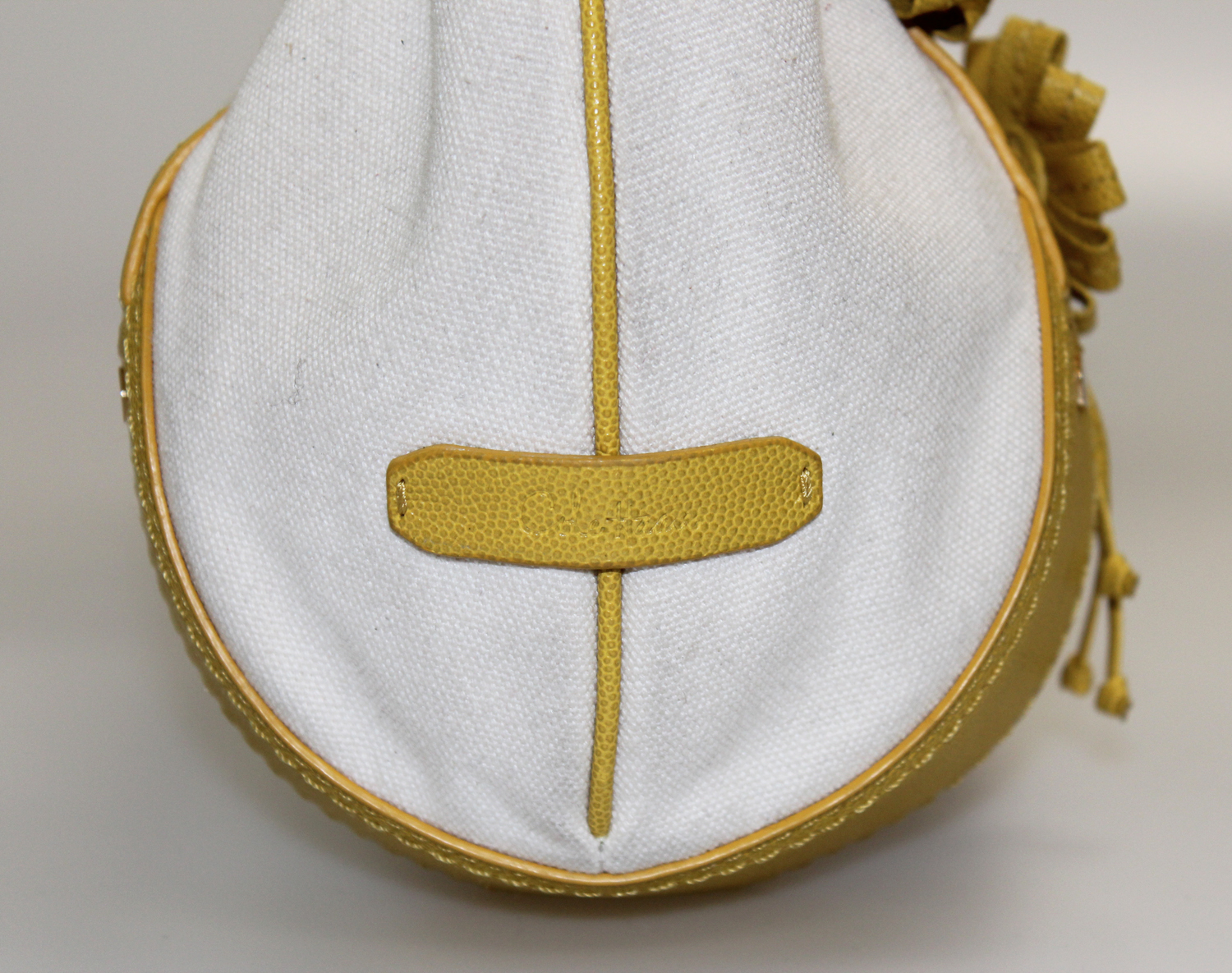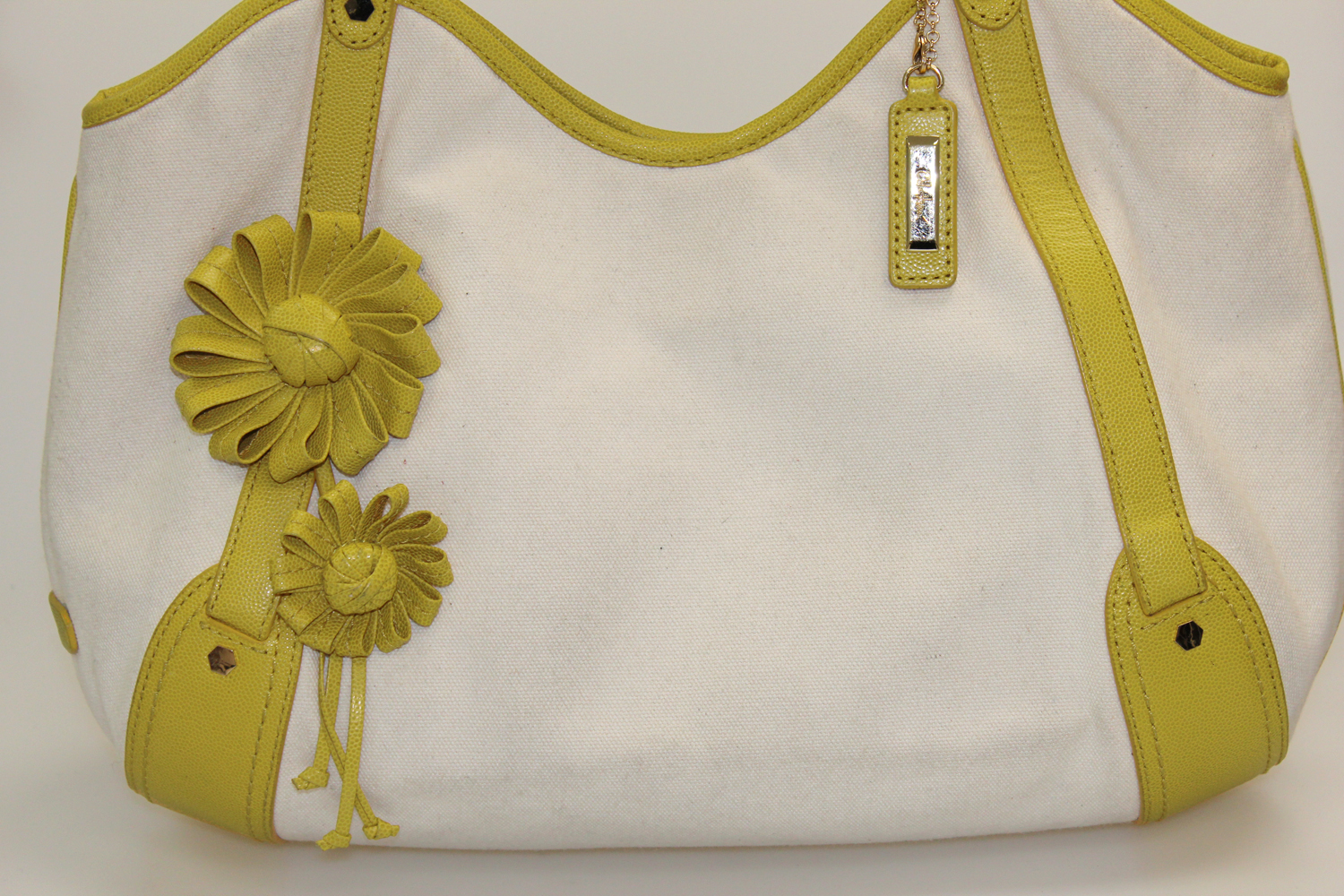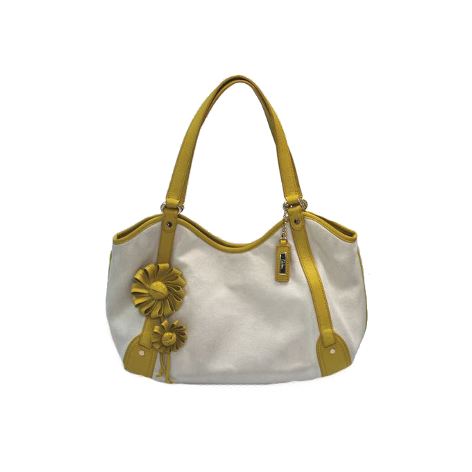 tote bag features contrast trim and handles, floral detail, and a
