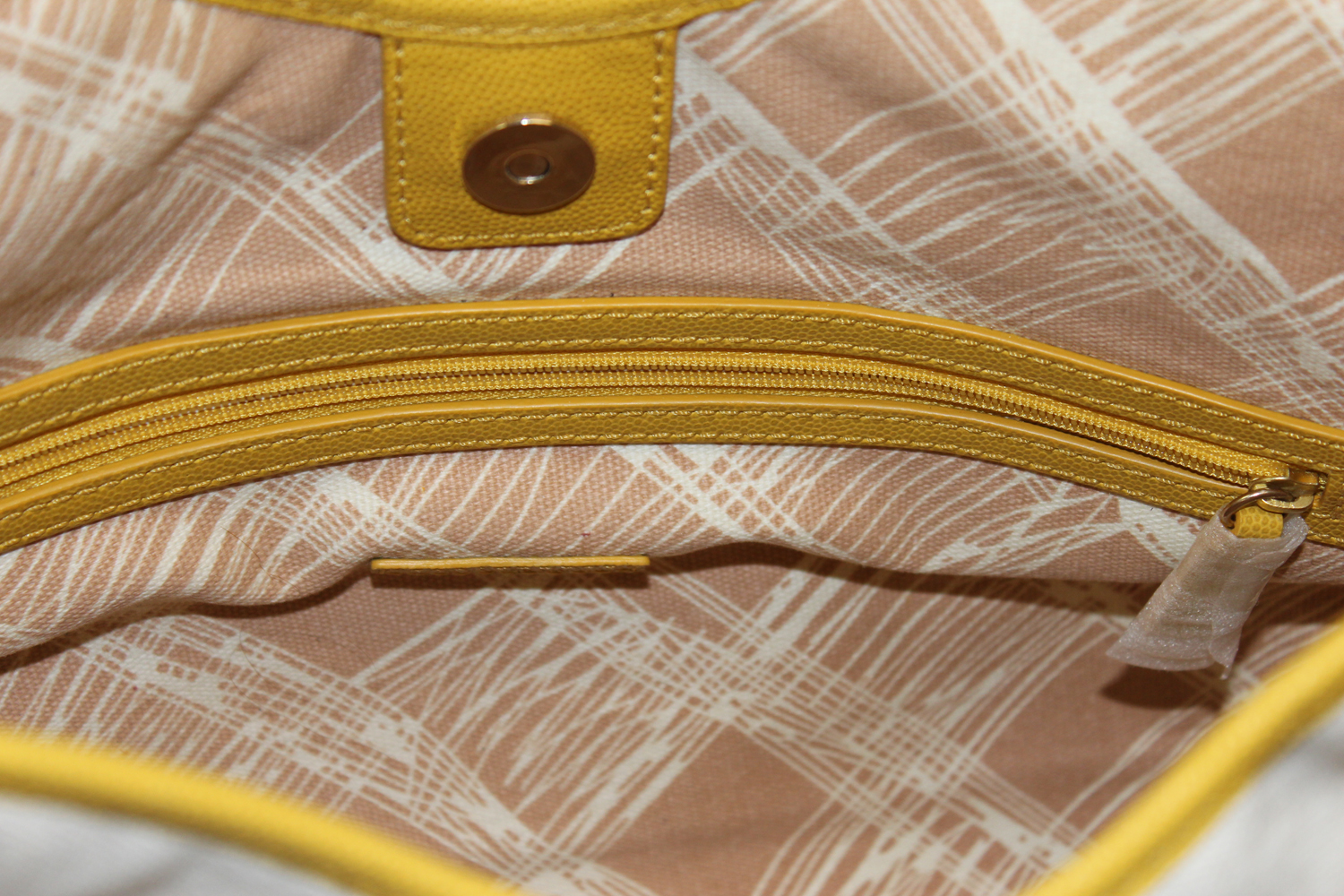 hanging logo tag. It has a magnetic snap closure and opens to reveal a