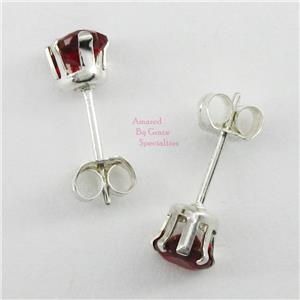 THE ROUND FACETED Garnet-colored Cubic Zirconia nestles into a four prong setting atop the stud earring. The openwork basket lends it's mirror-finish sparkle to the design, flaunting the ever-lively 4mm flush-set dark red stone.