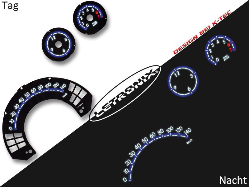 Mit unseren selbstleuchtenden Letronix Plasma Tachoscheiben im schwarzen Design (Design by K-Tec), verleihen Sie Ihrem Tacho eine individuelle und exklusive Optik. Die Tachoscheiben werden einfach gegen Ihre originalen Tachoscheiben ausgetauscht und der beiliegende Inverter wird dann an Plus und Minus angeschlossen.