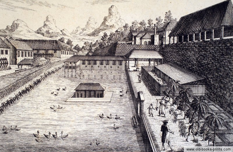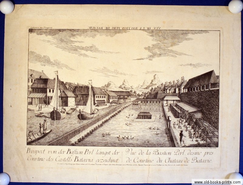 Eine Ansicht der Bastion Perl in Batavia, Original-Kupferstich von Francois Xav. Habermann, erschienen in Augsburg, um 1780. Betitelt: "Vue de la Bastion Perl de Batavie" (in Spiegelschrift über dem Bild für die Verwendung in einem Guckkasten) und "Prospect von der Bastion Perl längst der Courtine des Castells Batavia" (daneben rechts in Französisch betitelt). Reine Bildgrösse: 23,8 x 40 cm, Blattgrösse: 36,7 x 48,8 cm. Nur gering fleckig, einige hinterlegte Einrisse, im Plattenrand rechts etwas eingerissen, sonst recht gut erhaltenes Exemplar. Dekoratives Blatt mit reicher Figurenstaffage, auf dem Gewässer Boote und Wasservögel. Seltene Ansicht!! Original, kein Nachdruck, für die Echtheit wird garantiert!!