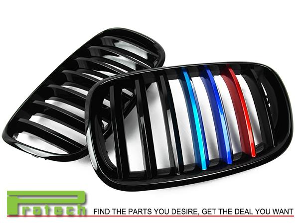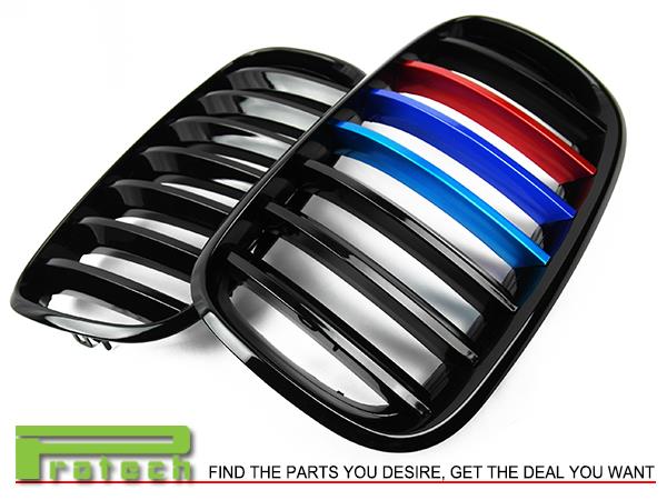 2007 - 2013 BMW X5 X6 (E70 E71 Model) OEM Look Shiny Black w/ M Tri Metal Color Front Kidney Grille