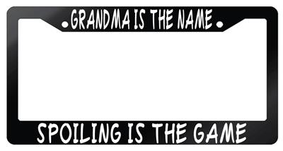 Glossy Black license plate frame Grandma Is The Name Spoiling Is The Game made from high impact ABS plastic, covered with color vinyl printing.