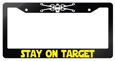 Glossy Black license plate frame Stay On Target Auto Accessory LOGO made from high impact ABS plastic, covered with color vinyl printing.