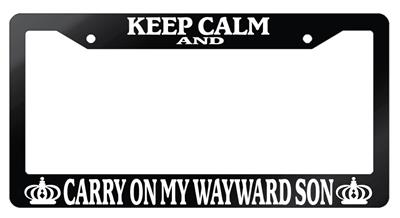 Glossy Black license plate frame Keep Calm And Carry On My Wayward Son made from high impact ABS plastic, covered with color vinyl printing.