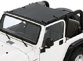 Bestop's Sun Bikini® top let's a Wrangler be what it wants to be - an open-air, blue-sky adventure vehicle. Sun Bikini® is an interior sun shade that attaches above the driver and passenger seats, and stays there whether your soft top is on or off the vehicle. No-drill attachment and easy roll-back storage when you want nothing between you and the sky. Installs in just a couple of minutes - no drilling, no muss, no fuss.