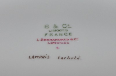 You have found the missing piece to your China Collection! Here is an accent salad or lunch plate from L. Bernardaud & Company, Limoges France. The pattern features an embossed scalloped, gold rim with a fish. The back looks like it reads: Lampris Tachete. The plate is 9 5/8" across, and in excellent preowned condition, no chips or cracks. Please see our Store for more of this pattern.