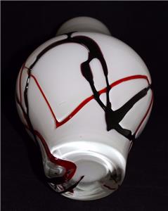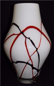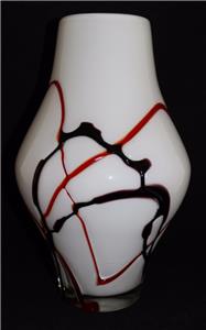 Art Glass, White 12" Vase w/ Red & Dark Purple Overlay Swirl Designs