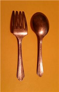 WOW ........... RARE VINTAGE "1940-60's BABY CHILDS SPOON and FORK SET - NURSERY SILVER PLATE A1" NICE CONDITION * 4" * VERY UNIQUE ITEM * A MUST HAVE! (very tough find!) additional auctions ship for free! Buy more - save More ......