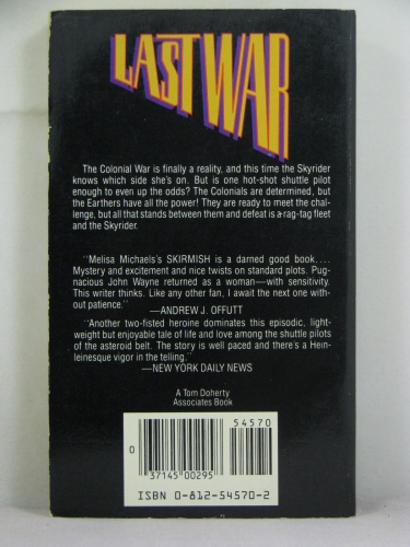 From the Back Cover: The Colonial War is finally a reality, and this time the Skyrider knows which side she's on. But is one hot-shot shuttle pilot enough to even up the odds? The Colonials are determined, but the Earthers have all the power! They are ready to meet the challenge, but all that stands between them and defeat is a rag-tag fleet and the Skyrider.