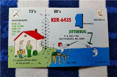 WOW! ........... RARE VINTAGE "HAM CB CITITZENS BAND BASE STATION SHORT WAVE RADIO QSL TRADING CARD * MOCKINGBIRD & MAGNOLIA - GRAPHICS : FISHERMAN - JITTERBUG - HATTIESBURG, MS MISSISSIPPI" - VERY UNIQUE ITEM * JUST IN! (great find!) additional auctions ship for free! Buy more - save More ......