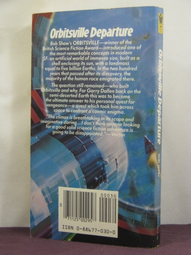 From the back cover: Bob Shaw's Orbitsville - winner of the British Science Fiction Award - introduced one of the most remarkable concepts in modern SF: an artificial world of immense size, built as a shell enclosing its sun, with a landmass equal to five billion Earths. In the two-hundred years that passed after its discovery, the majority of the human race emigrated there.