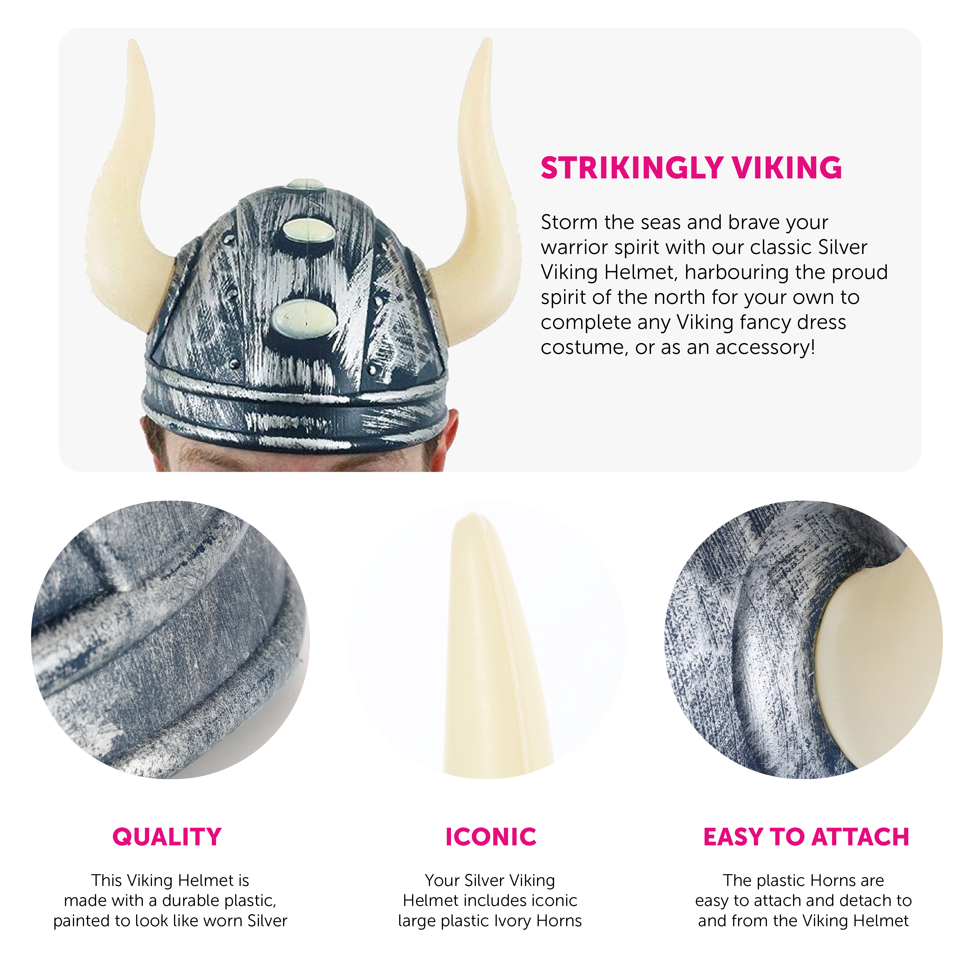 VIKING HELMET INCLUDES: Your Viking Helmet will include a Viking Helm, and 2 Viking Horns for you to attach on each side of the dome of the helm, for you to complete the look and stand proud!