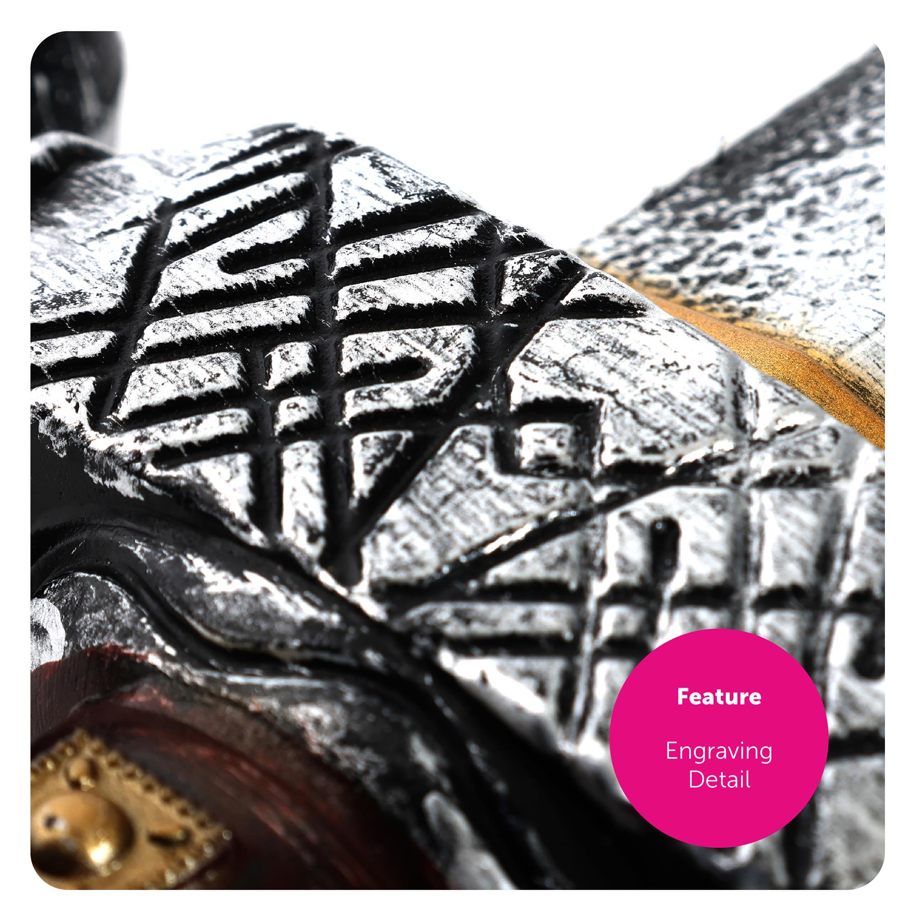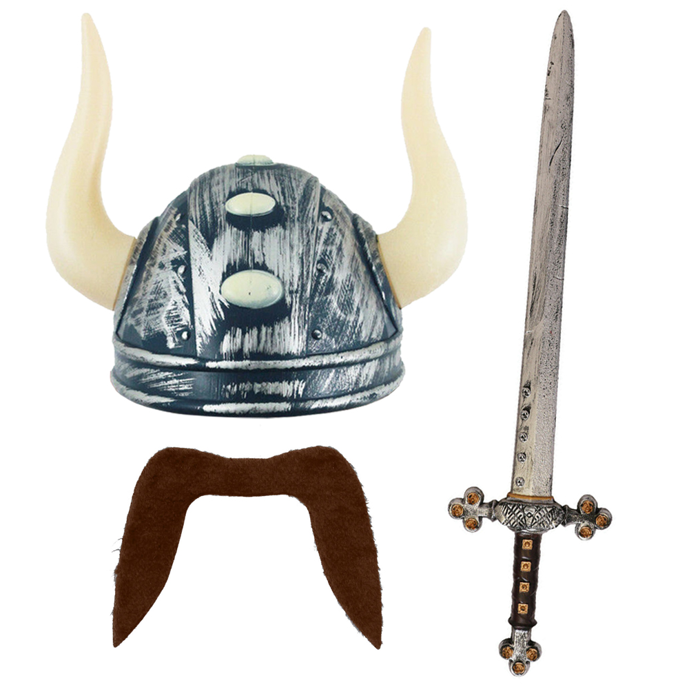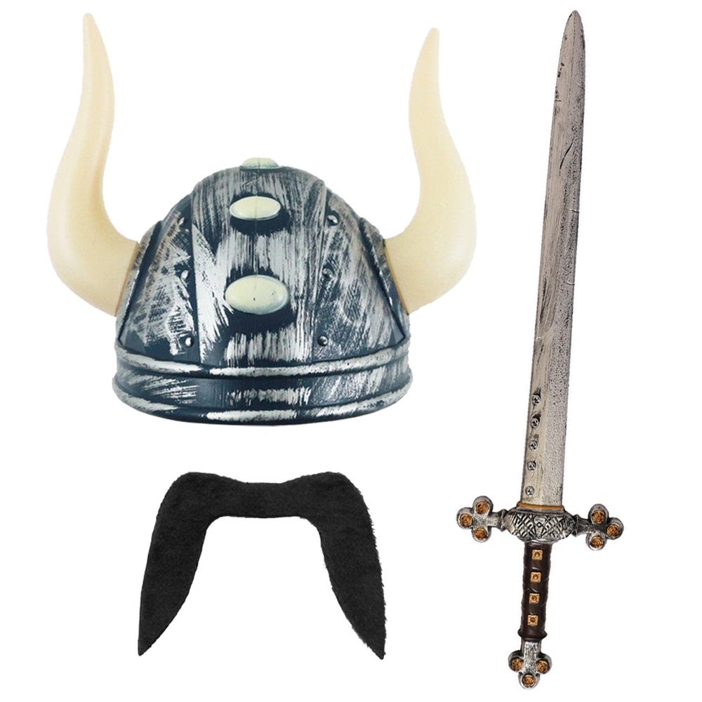 ACCESSORY SET INCLUDES: Your Adults Viking Accessory Set includes a Silver Plastic Viking Helmet with Ivory coloured Horns on either side, a Plastic Sword with a Silver Blade and a Dark Brown handle, detailed with engraved patterns and metallic Gold Rose decoration and an Adhesive Black Moustache!