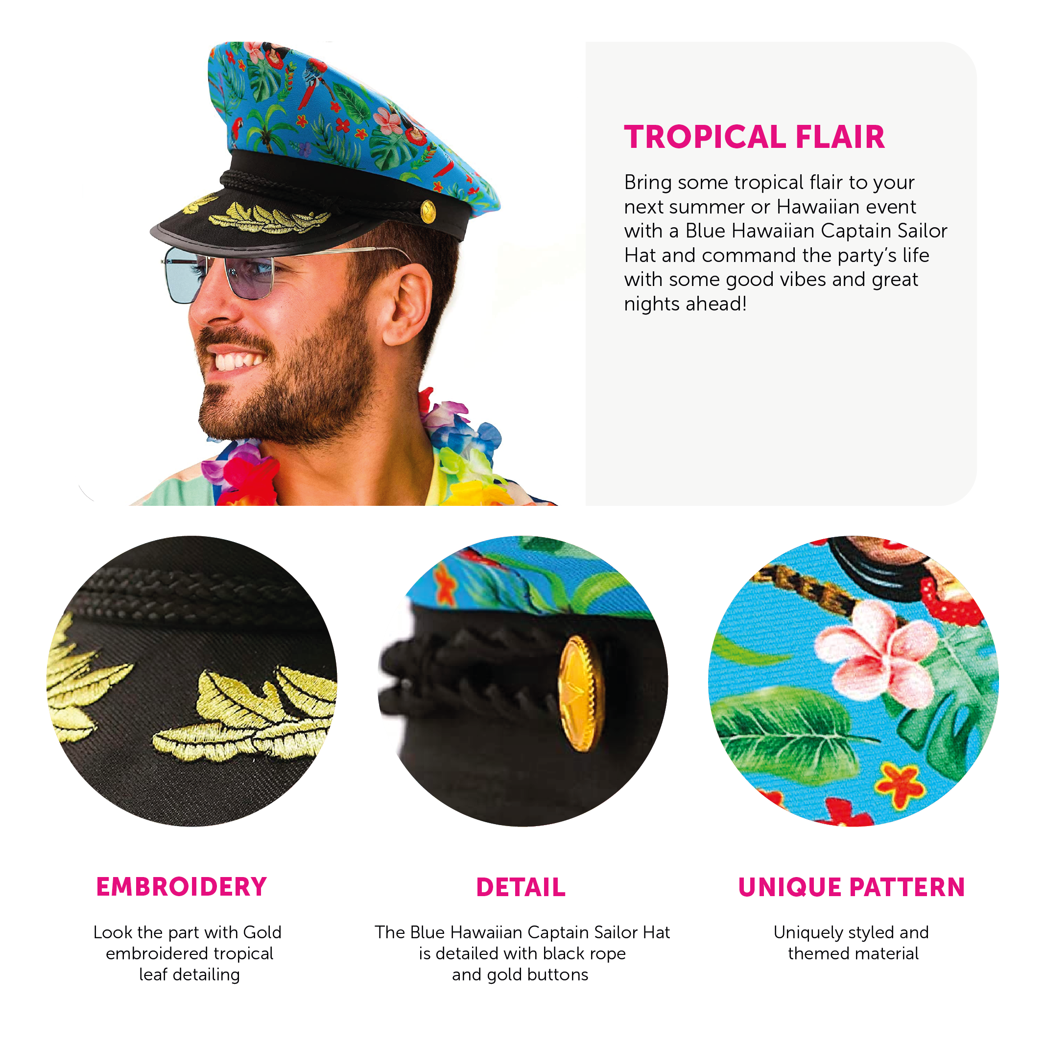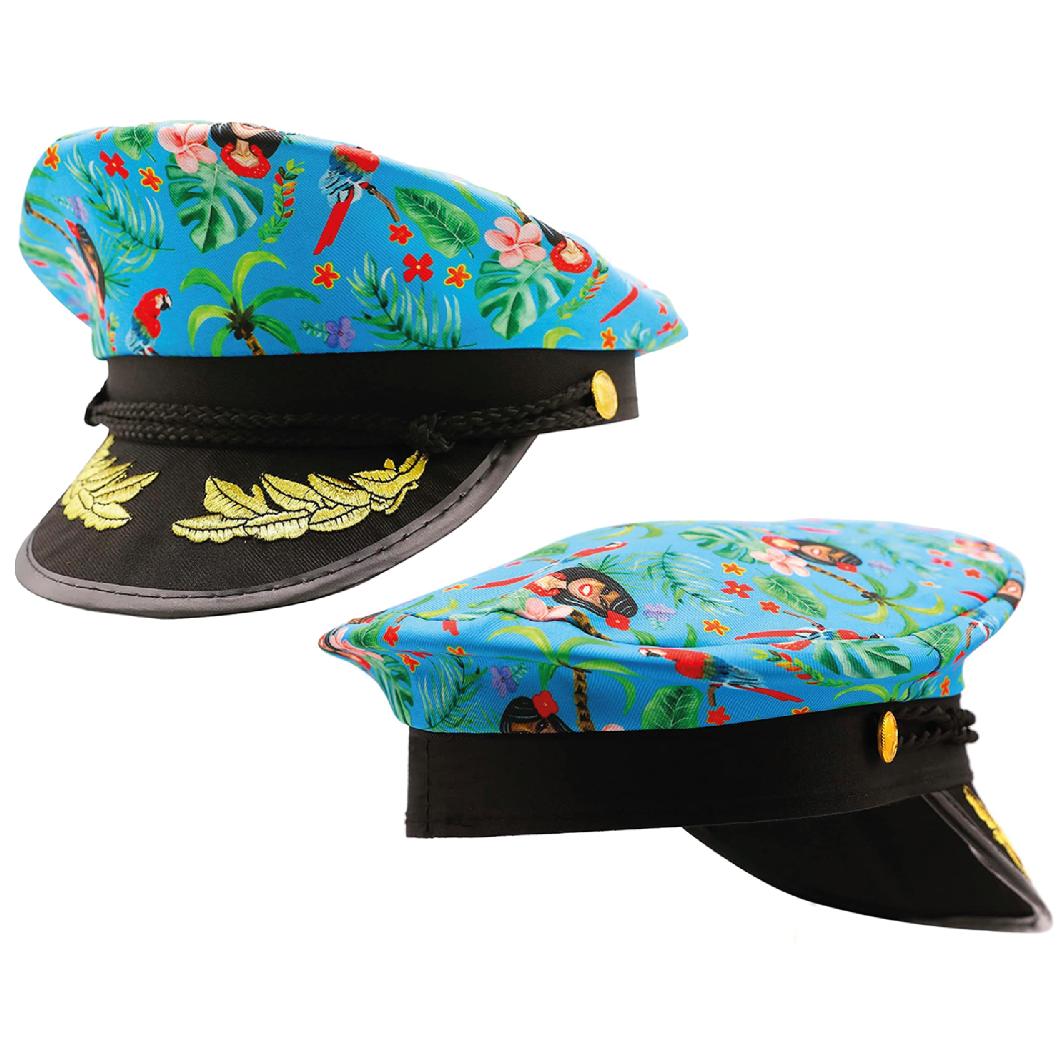 BLUE HAWAIIAN CAPTAIN SAILOR HAT: Bring some tropical flair to your next summer or Hawaiian event with a Blue Hawaiian Captain Sailor Hat and command the party’s life with some good vibes and great nights ahead!