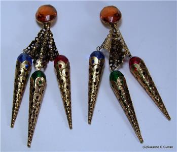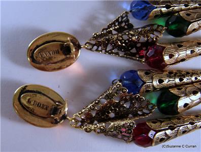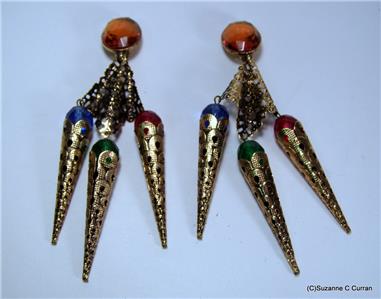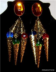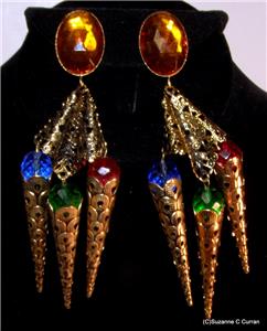 So Over the Top!! Vintage Designer G Donn Antiqued Gold Tone Earrings, designed with a Large Faceted Amber Glass Cabochon at the top and Dangling Multi Colored Glass Balls. Clip Earrings that measure 5" in length and in Excellent Condition. Marked 'G Donn' on Clip Back. What a Great Looking Pair of Earrings that Will Make a Big Statement!! Ready to Add to Your Collection or a Perfect Gift for Someone Special!!!
