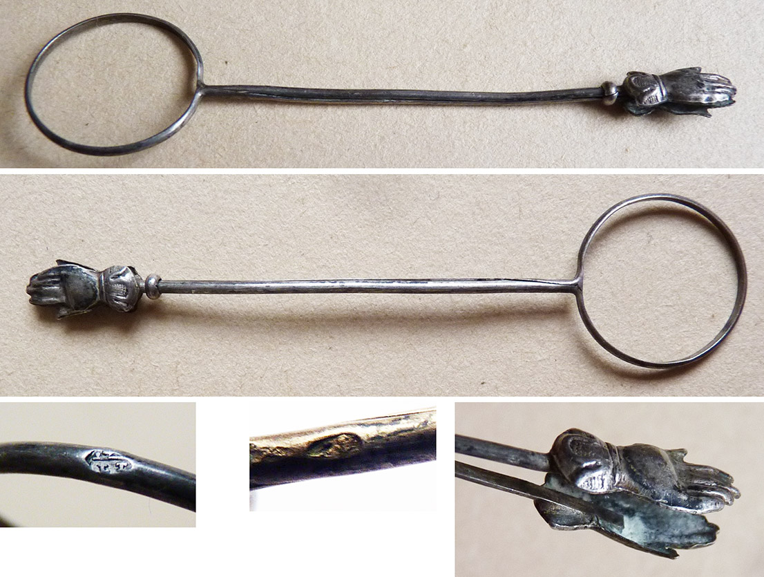 Instrument qui permettait aux dames de qualité tenir une cigarette avec élégance. Les 2 mains s'écartent et peuvent pincer (grace à l'anneau coulissant) la cigarette. Objet en argent massif. Poinçon "lièvre" (poinçon français utilisé entre 1819 et 1838). Longueur : 8,1 cm. Objet très rare !