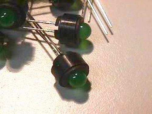 Notes These have a 5 mm round body with a 7.5 mm flange diameter and are 3 mm tall from flange. Included and mounted on each is a clip and ring for panel installation which requires a 6.3 mm hole enabling the assembly to snap into place. The green LED has a peak wavelength of 567nM at 20mA, 2.1 - 3.0 DC volts. The luminous intensuty is typically 8.9 mcd. A data sheet is available.