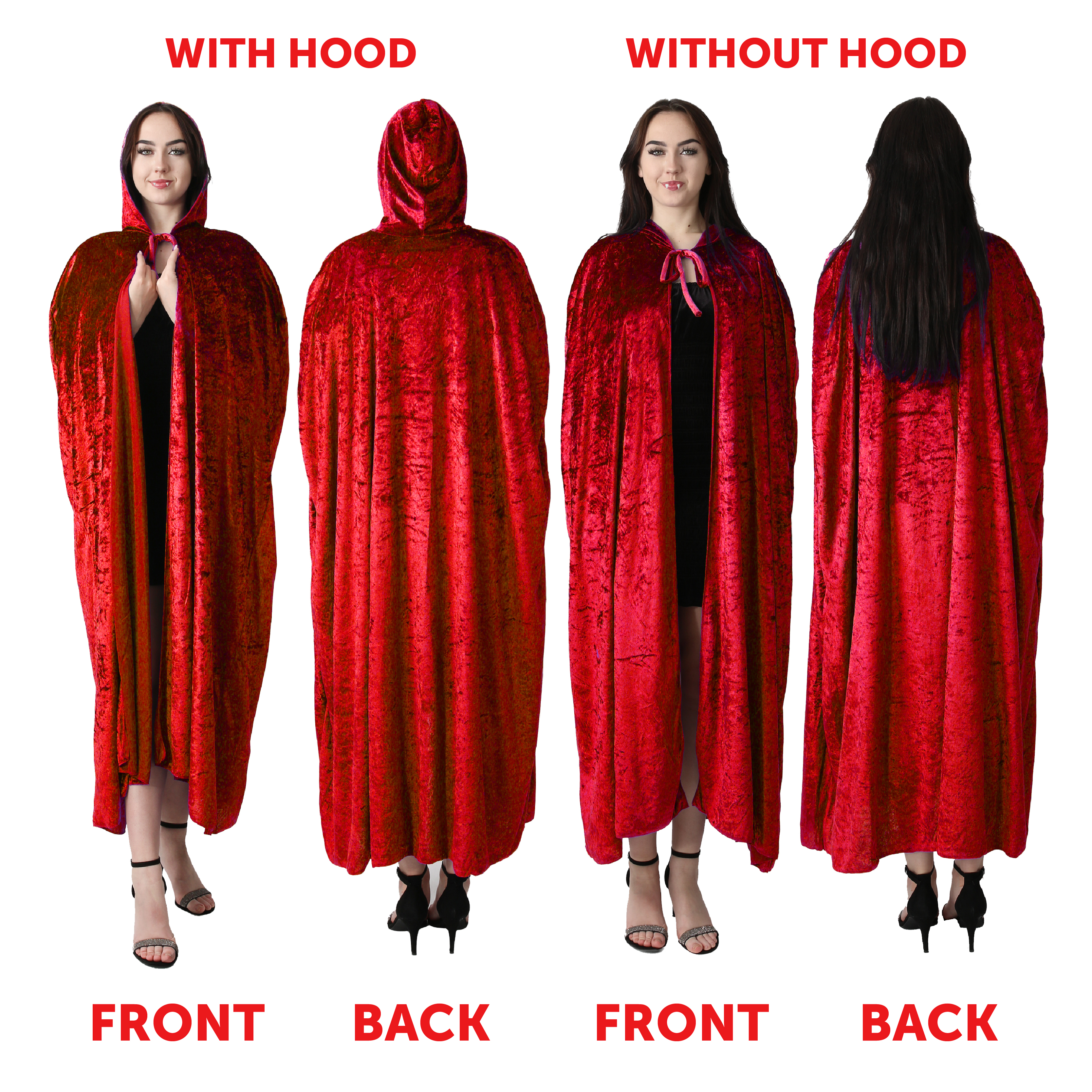 ADULTS LONG VELOUR CAPE DETAILS: Your Adults Red Velour Cape is a long, calve-length cape, with an attached hood on the cape, and a Red drawstring to tie the cape across your neck comfortably!